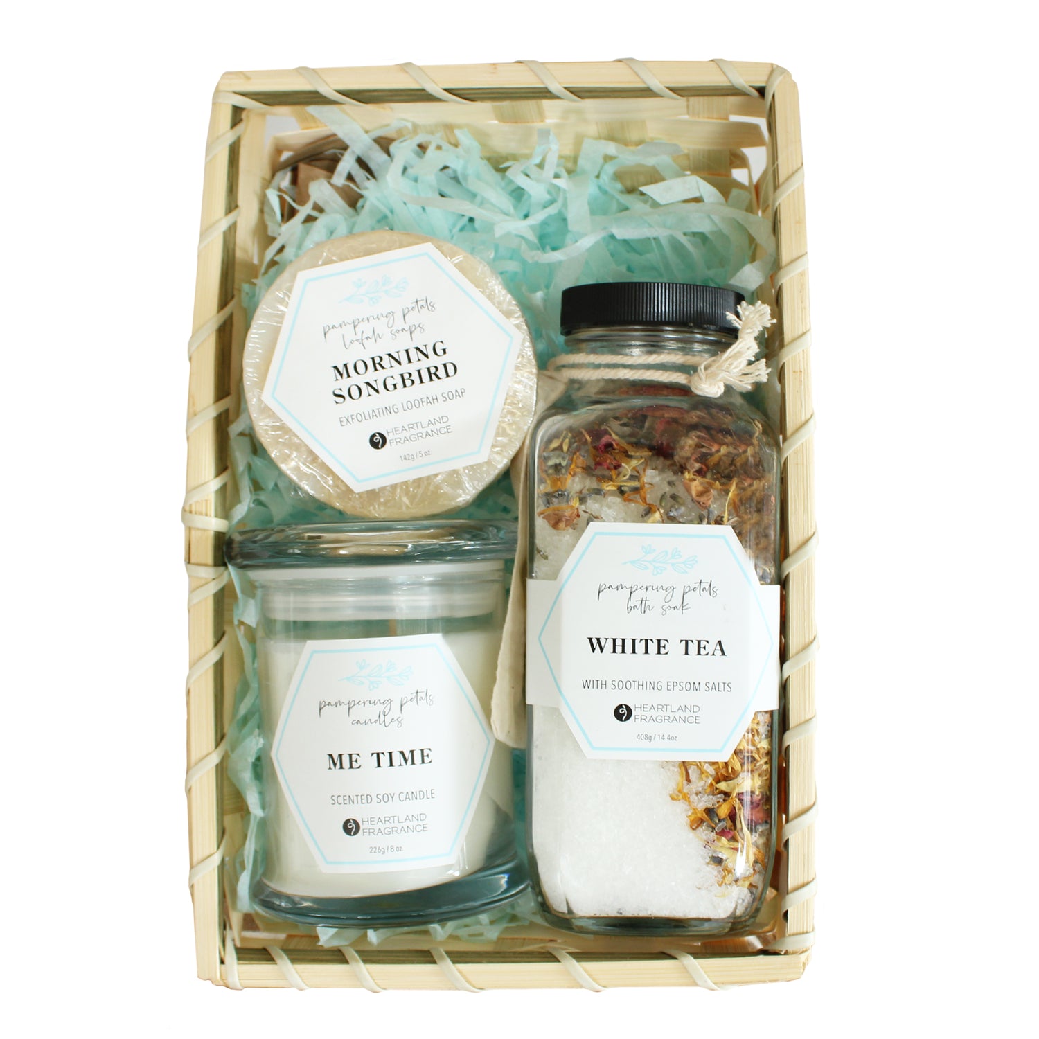Indulge in the ultimate pampering experience with the Pampering Petals Gift Set. This luxurious spa experience is elegantly packaged in a reusable basket, offering a complete self-care package. Immerse yourself in the enchanting ambiance created by the romantic candle, while the bath soaking salt with botanical petals transforms your bath into a soothing oasis of relaxation. The exfoliating loofah soap gently buffs away impurities, leaving your skin feeling renewed and rejuvenated. Treat yourself or someone special to this exquisite Pampering Petals Gift Set and embrace a world of serenity and indulgence.